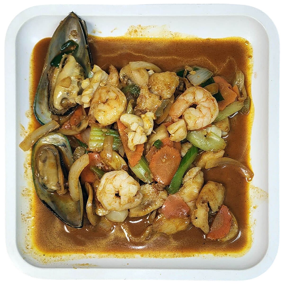 Bold and spicy seafood stir-fry packed with shrimp, mussels, and fresh vegetables.